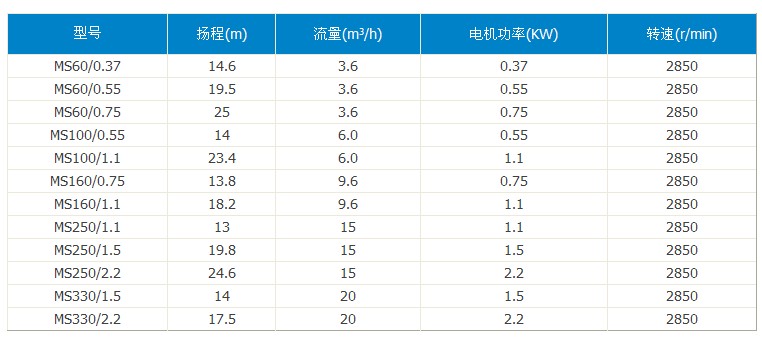 同系列南方泵技術參數(shù)如下: