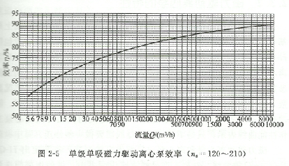 或ns> 210時,單級單吸磁力驅動離心泵的效率值為由圖2-5查得的效率值與因比轉數(shù)ns。不同而引起的效率修正值之和。