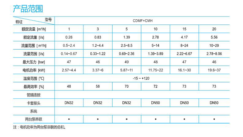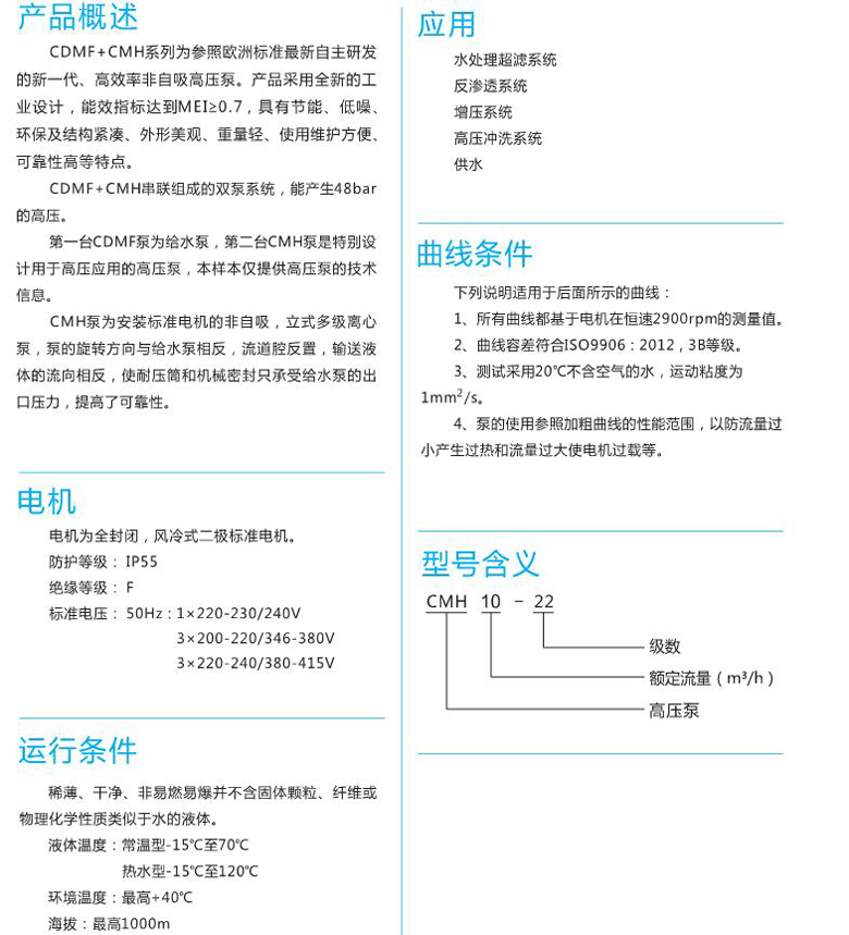CDMF+CMH系列為參照歐洲標準自主研發(fā)的新一代、高效率非自吸高壓泵。產(chǎn)品采用全新的工業(yè)設(shè)計,能效指標達到MEI≥0.7,具有節(jié)能、低噪、環(huán)保及結(jié)構(gòu)緊湊、外形美觀、重量輕、使用維護方便、可靠性高等特點。