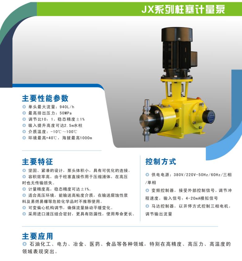 南方JX系列柱塞計量泵:偏心機構(gòu)驅(qū)動,結(jié)構(gòu)緊湊;流量調(diào)節(jié)為可變偏心滑軸(Z形軸)調(diào)節(jié)機構(gòu);堅固、緊湊的設(shè)計,泵頭體積小,具有可優(yōu)化的連接
