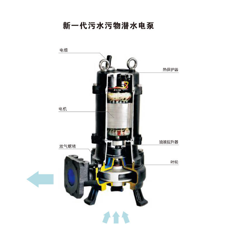 南方WQ污水污物潛水電泵由電機與泵兩部分組成,兩者通過油室及機械密封組件隔開,分固定式自動耦合安裝和移動安裝。